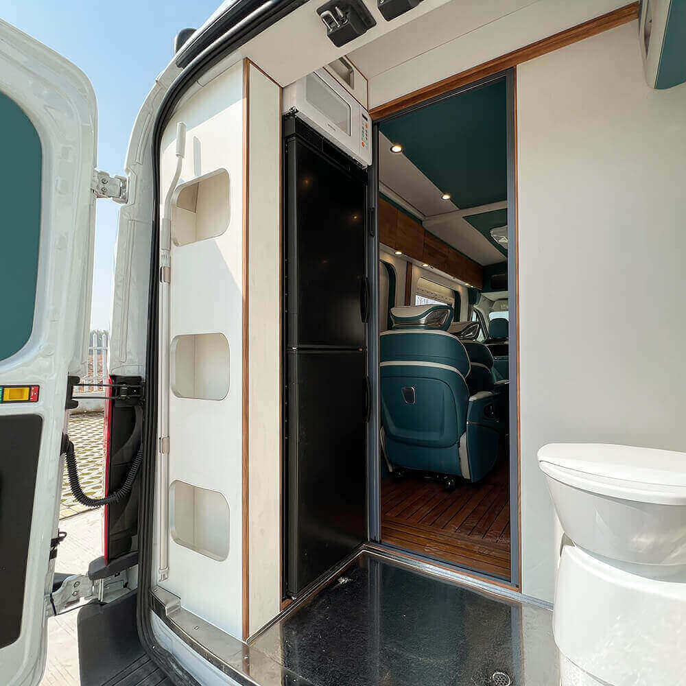 ARANA’s compressor fridge maximizes vertical space and combines practicality and visual appeal that redefines modern RV layouts.